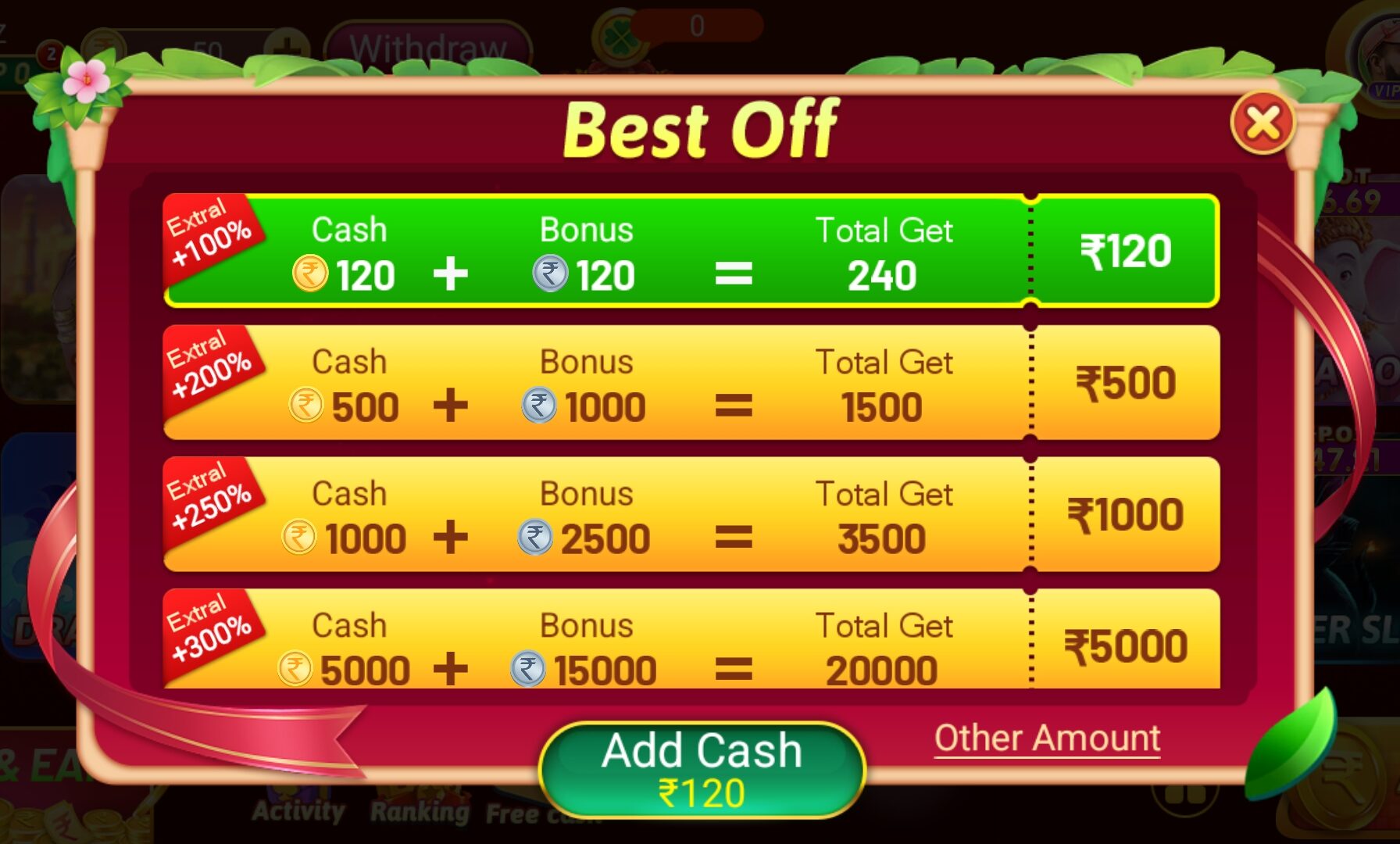 You will Get Some Huge Discounts and Extra Bonus on Regular Day while Playing Game Regularly You will Find 500 to 5000 Bonus by adding Cash which is Time being offer for some few minutes or time.